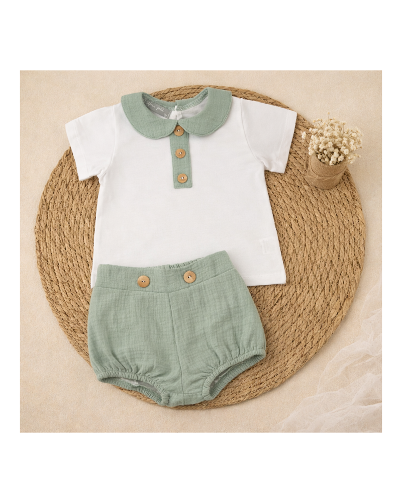 Conjunto de bebé compuesto por camiseta y pantalón corto coordinado, diseñado con un estilo delicado y atemporal.