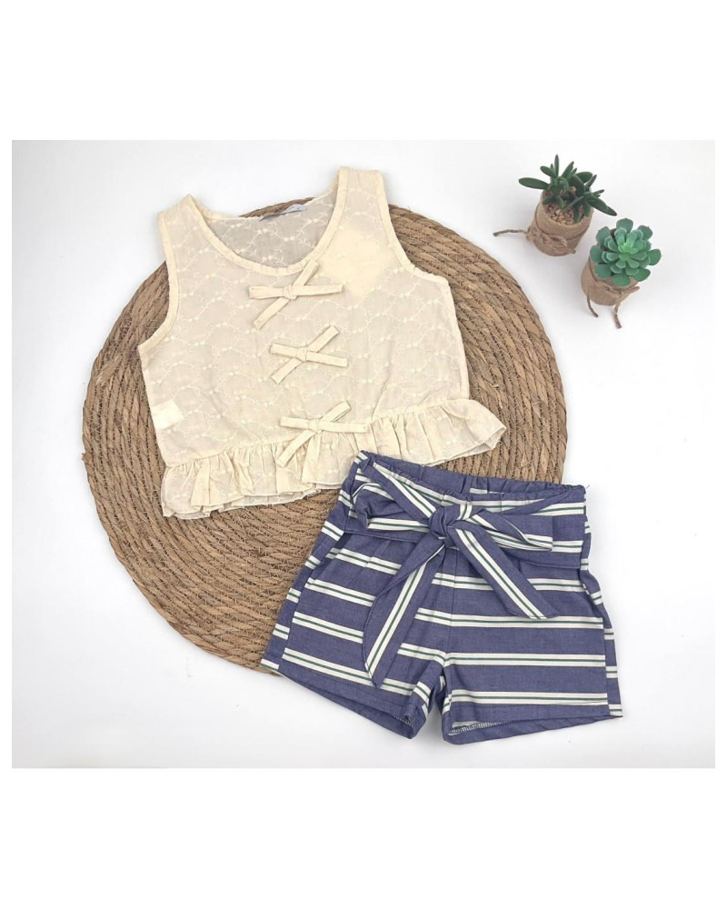 Conjunto infantil de niña compuesto por top sin mangas en bordado inglés color crudo, con delicado diseño calado y tres lazos decorativos en el delantero. El bajo incorpora volante fruncido que aporta movimiento y un acabado romántico y cuidado.